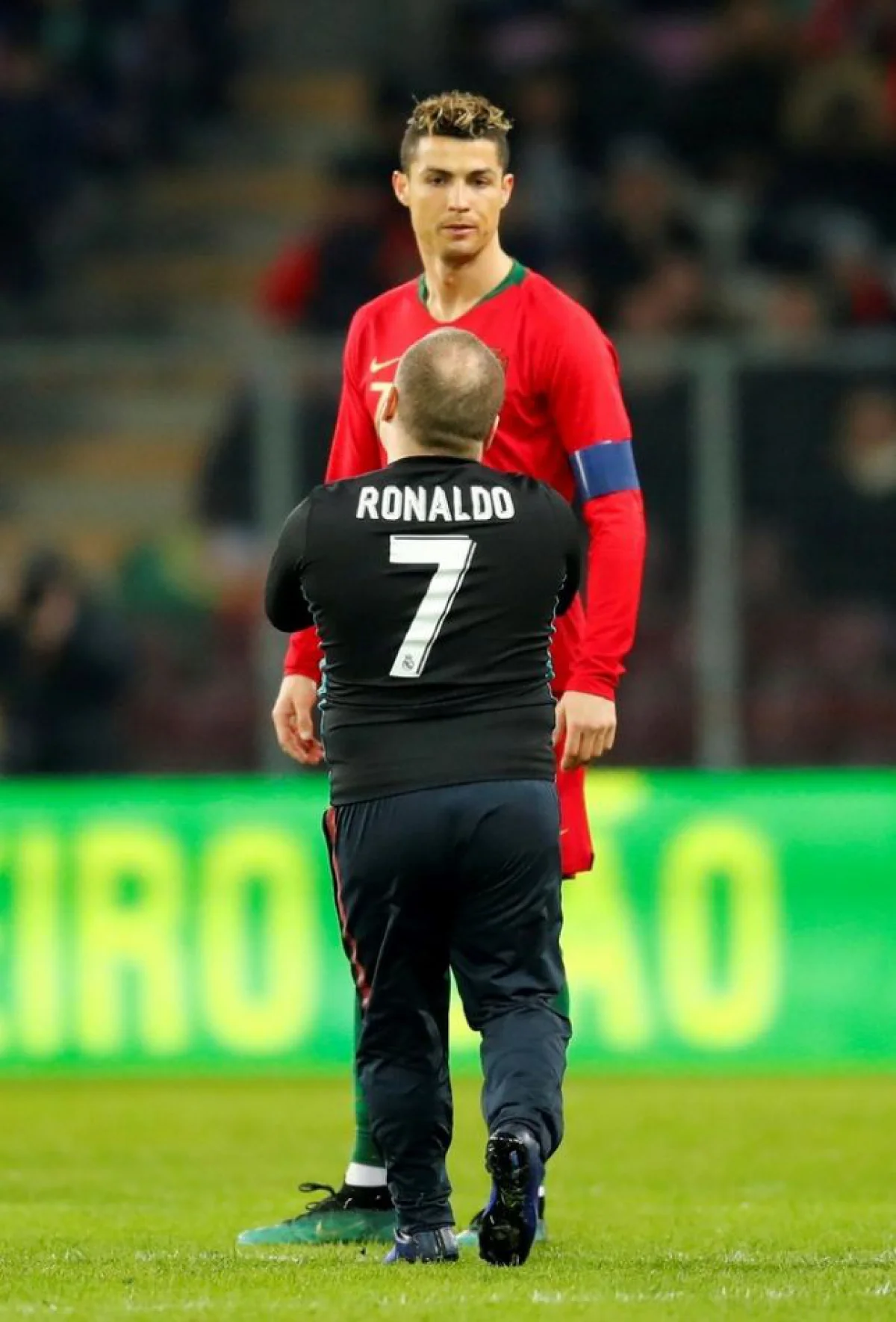 Los dos llamaron la atención ante la mirada de Cristiano Ronaldo, súper fastidioso. El primero le dio un beso y se quiso sacar una selfie en pleno campo de juego. El otro, de baja estatura y con la clásica camiseta 7 del goleador, lo abrazó. A pesar de su cara de pocos amigos, CR7 estuvo bien en su gesto.