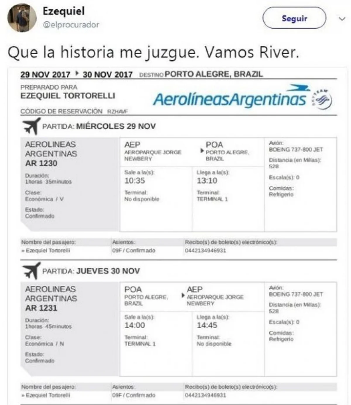 El fanático subió a su cuenta de Twitter la copia de la reserva. "Que la historia me juzgue. Vamos River", escribió. Pero lo que jamás se imaginó es que el equipo de Gallardo se iba a quedar afuera y, lo peor de todo, los que lo iban a juzgar eran hinchas de Boca, que desde el martes a la noche no paran de cargarlo.