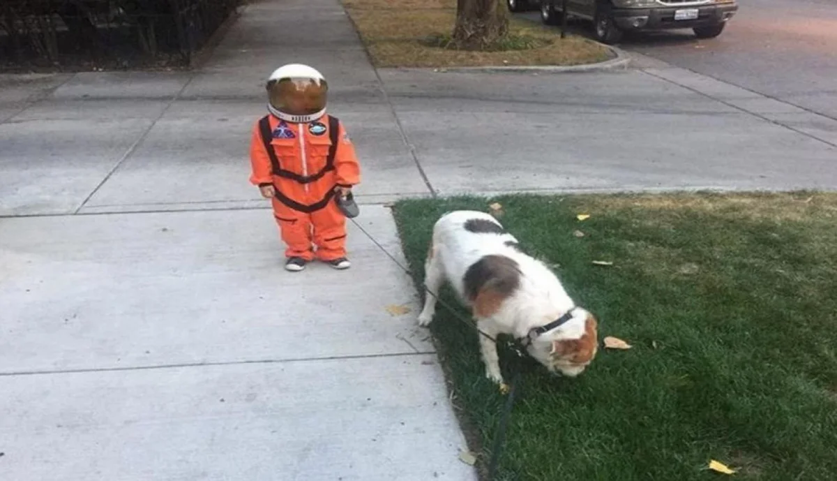 La foto original es una tiernísima foto de un niñito disfrazado de astronauta paseando a su perro, pero como las redes sociales no perdonan nada, estallaron los memes.