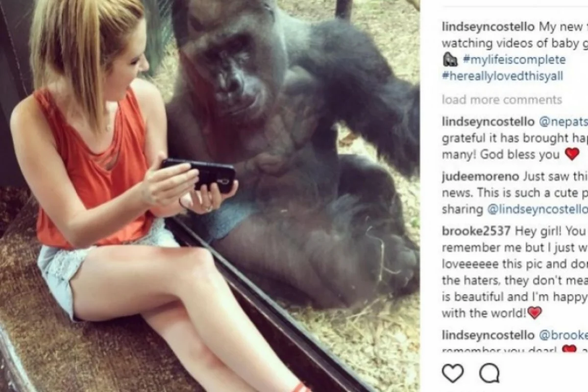 “Mi nuevo amigo y yo disfrutamos viendo videos de gorilas bebés”, ha publicado Costello junto a la foto de ella y el animal.