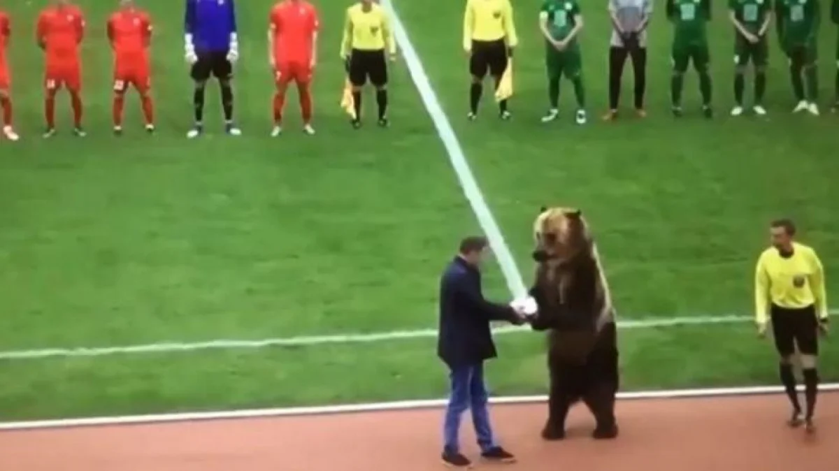 Un oso hizo el saque de honor en el choque entre los equipos de fútbol Masjoek y Angoesjt, de la tercera división de Rusia, sorprendiendo a todos los espectadores.