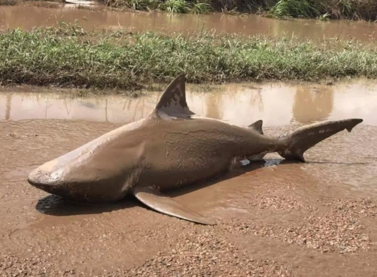 El paso del poderoso ciclón “Debbie” ha dejado escena insólita, ya que los equipos de emergencia encontraron un tiburón toro muerto de metro y medio varado en un charco en mitad de una carretera en la localidad de Ayrl, a 10 kilómetros de la costa.