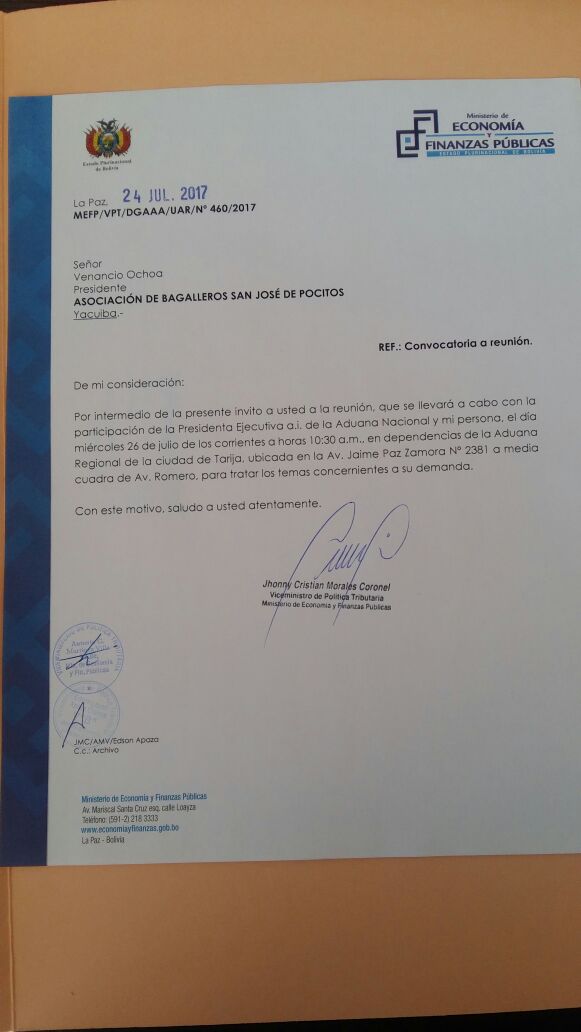 El Ministerio de Finanzas y Economía del Pluriestado Nacional de Bolivia, dio a conocer el pedido de reunión de autoridades nacionales de dicho pais con referentes de los bagayeros que encabezan el corte en el puente internacional.