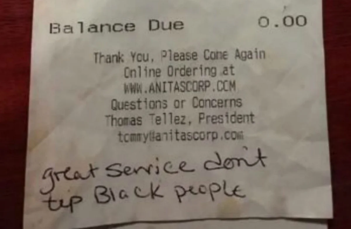 Kelly Carter, camarera del restaurante Anita's New Mexico Style Café en Ashburn, en el Estado de Virginia, tuvo una desagradable sorpresa cuando, al comprobar la factura de unos clientes, vio que estos le dejaron una nota que decía "gran servicio, no damos propina a negros", según informa BBC.Los hechos ocurrieron el pasado sábado por la mañana, en el desayuno. Los clientes, una pareja, hombre y mujer blancos de unos 20 años, incluso felicitaron a Carter por el servicio prestado, pero a la hora de pagar la cuenta le negaron la propina y le dejaron la desagradable nota. Dos clientes habituales del local fueron los que subieron la factura a Facebook, que rápidamente se hizo viral.