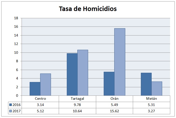 El Distrito Orán registra el incremento más notable del año 2017, pues de los 9 casos ocurridos en 2016 pasó a 26, casi triplicando la cifra. Este fuerte aumento elevó la tasa de homicidios de ese distrito de 5.49 a la cifra récord de 15.62, algo totalmente inédito y alarmante para esa región.