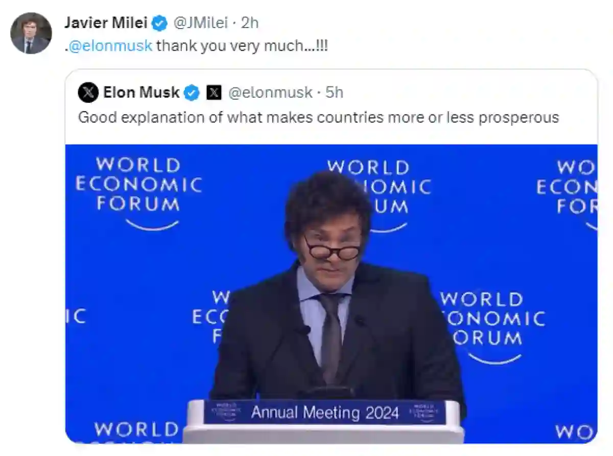 "Buena explicación de lo que hace que los países sean más o menos prósperos", escribió Musk en su cuenta personal X y acompañó su opinión con el video de la exposición realizada este miércoles por el mandatario en la reunión que anualmente convoca a jefes de Estado y empresarios de las finanzas de todo el mundo.