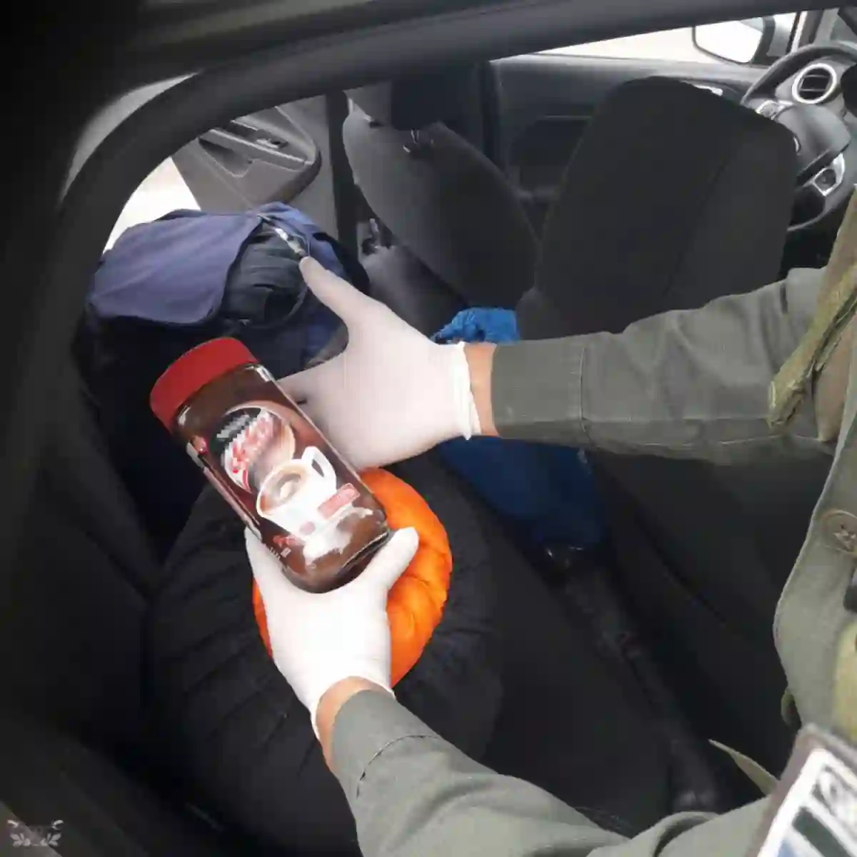 Continuando con la requisa, hallaron en el baúl del rodado una caja de cartón donde se ocultaba otro frasco de vidrio con café y un envoltorio con 25 cigarrillos de marihuana (14 gramos). Un total de 29 gramos de marihuana (53 cigarrillos) fue secuestrado.