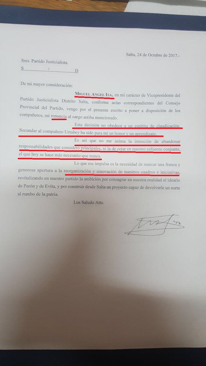 Mediante carta, Isa expresa que "no me anima la intención de abandonar responsabilidades que considero principales, ni la de cejar en nuestro esfuerzo conjunto, el que hoy se hace mas necesario que nunca".