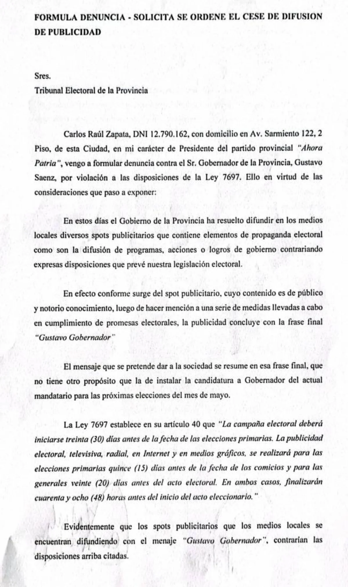 Presentaron una denuncia en el Tribunal Electoral por parte del Diputado Nacional Carlos Zapata contra el Gobernador Gustavo Sáenz pidiendo el cese de la difusión de los spots publicitarios con elementos de propaganda electoral.