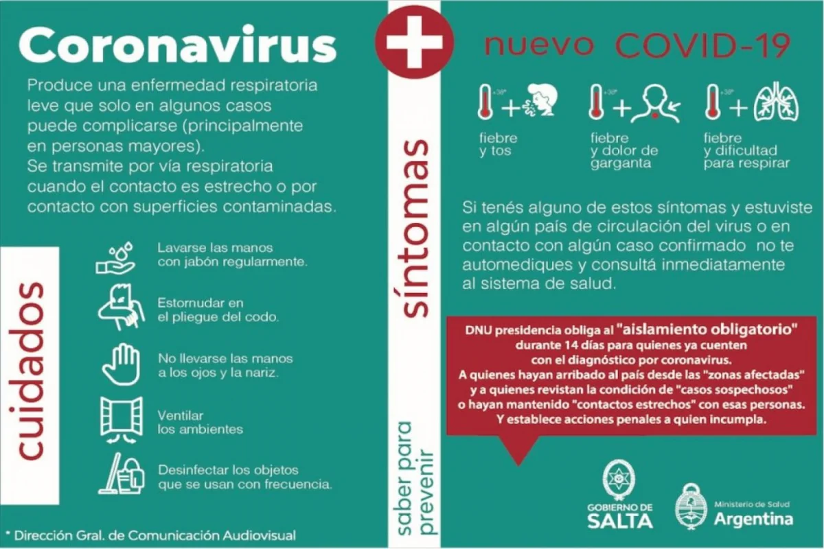 El Gobierno de la Provincia reitera que está en vigencia el Decreto de Necesidad y Urgencia de presidencia de la Nación por el cual se obliga al aislamiento obligatorio por catorce días a las personas que cuenten con diagnóstico de coronavirus; a los que retornen al país desde zonas afectadas, a quienes revistan la condición de casos sospechosos o hayan mantenido contactos estrechos con esas personas. En caso de incumplimiento, se incurre en un delito con acciones penales.