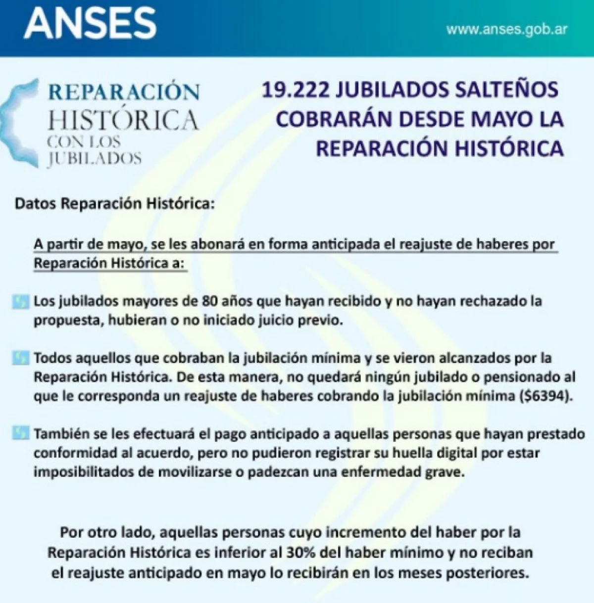 Finalmente aquellas personas cuyo incremento del haber por la reparación historica es inferior al 30% del mínimo y no reciban reajuste anticipado en este mes, lo recibirán en los meses posteriores.