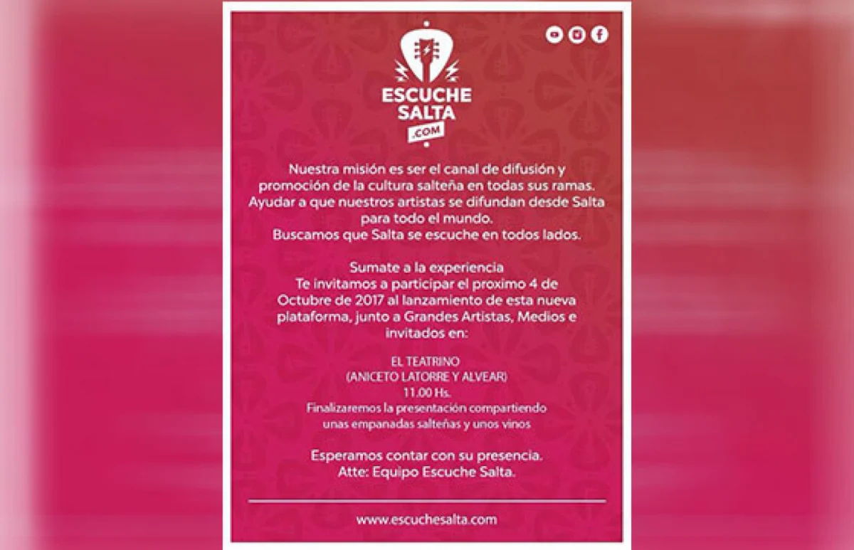 En el sitio de Escuche Salta podrán encontrar la actualidad del arte local y gran parte de la historia de quienes dedicaron sus vidas a enaltecer la cultura salteña. Tiene como principal objetivo ser canal de difusión y promoción de la cultura en todas sus ramas y ayudar a que los artistas locales difundan desde Salta para todo el mundo.
