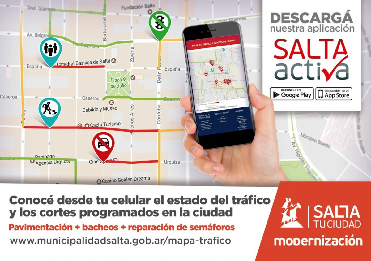 La Municipalidad de Salta puso a disposición de los vecinos un mapa de tráfico en su sitio web y la app Salta Activa para informar sobre el estado del tránsito y los cortes en las calles.