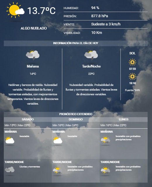 El Servicio Meteorológico Nacional indica que arrancamos el último día hábil de la semana con 13.7°C y se espera una máxima de 23°C. Además hay probabilidad de lluvias y tormentas aisladas.
