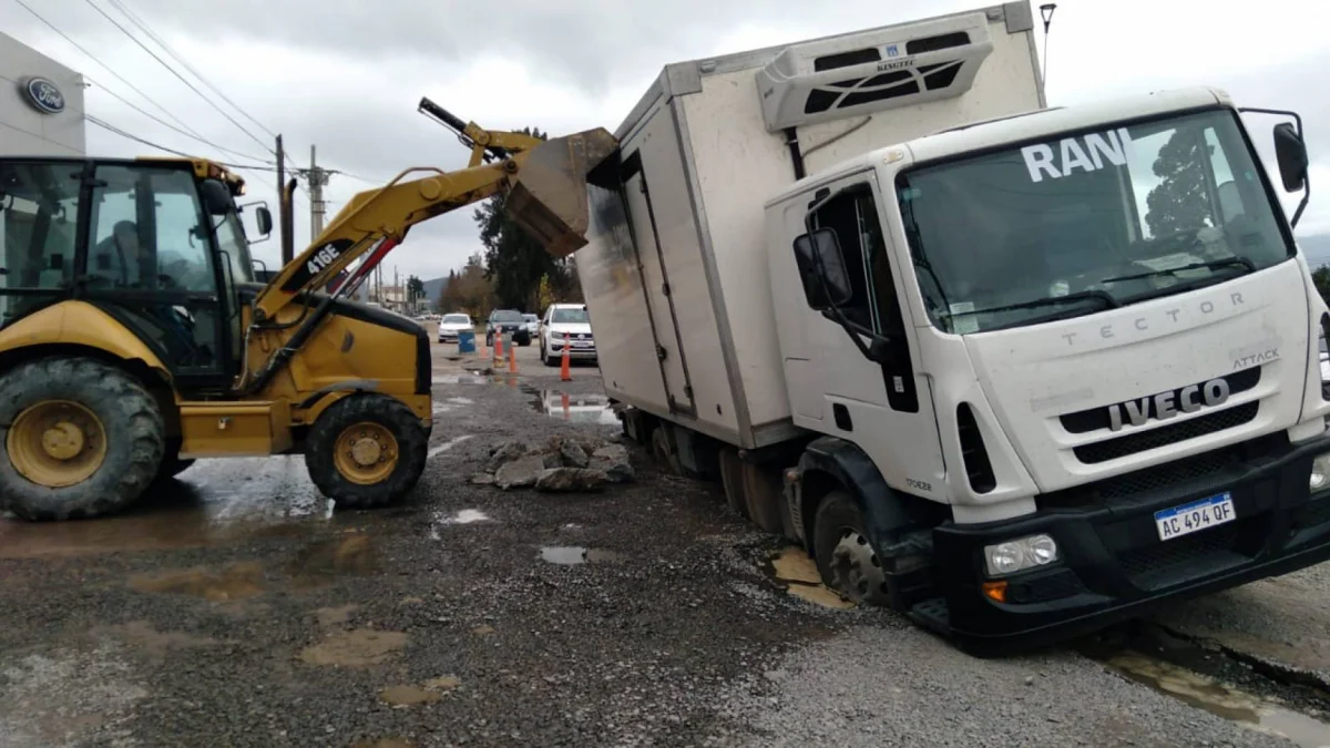 Otro siniestro vial sucedió durante esta mañana debido al mal estado de las calles de la ciudad. Un camión que transportaba alimentos congelados se hundió en un pozo donde había una importante perdida de agua.